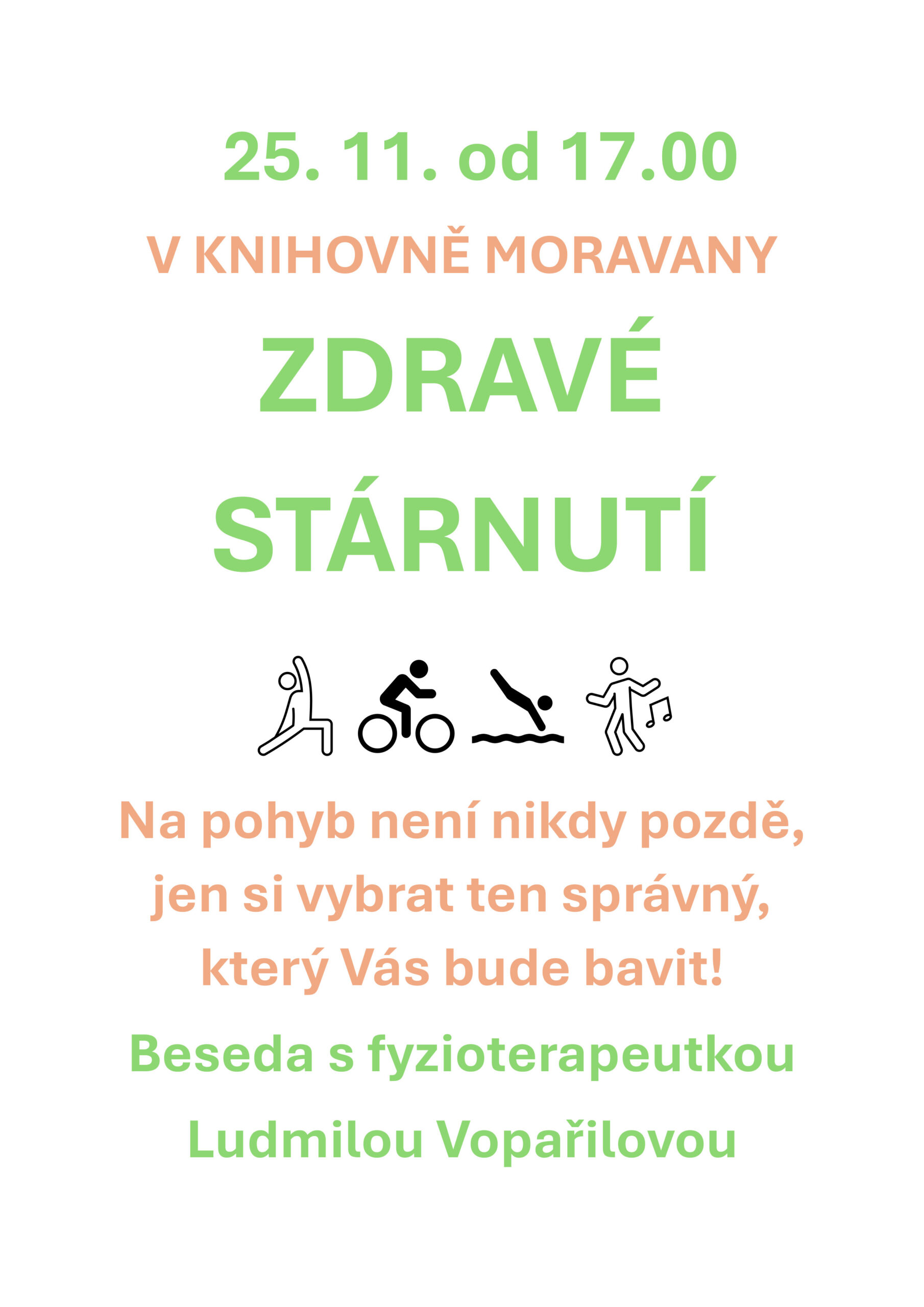 Na pohyb není nikdy pozdě, jen si vybrat ten správný, který Vás bude bavit! Beseda s fyzioterapeutkou Ludmilou Vopařilovou